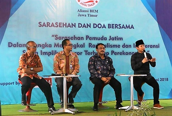 “Sarasehan Pemuda Jatim dalam Rangka Menangkal Radikalisme dan Intoleransi serta Implikasi Teror terhadap Perekonomian” berlangsung di Sengkaling Kuliner, Universitas Muhammadiyah Malang, Jumat, 8 Juni 2018.