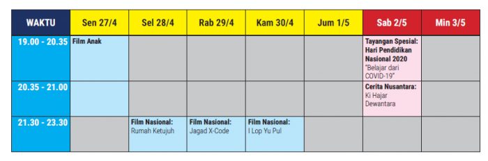 Selain jadwal acara Belajar dari Rumah hari ini, TVRI juga telah merilis jadwal selama pekan ini:
