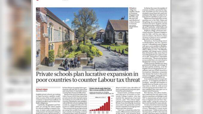 Menurut The Guardian, sekolah-sekolah swasta elit Inggris sedang berpacu untuk membuka operasi mereka di sejumlah negara yang paling miskin di dunia sebagai cara memenuhi kewajiban di dalam negeri dengan status lembaga amal.
