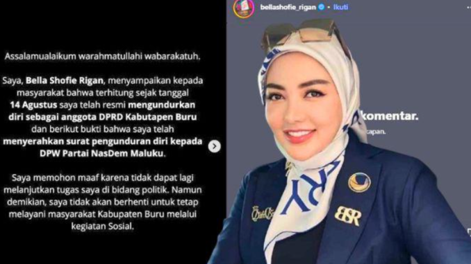 “Saya, Bella Shofie Rigan, menyampaikan kepada masyarakat bahwa terhitung sejak tanggal 14 Agustus saya telah resmi mengundurkan diri sebagai anggota DPRD Kabutapen Buru,” tulis Bella Shofie.